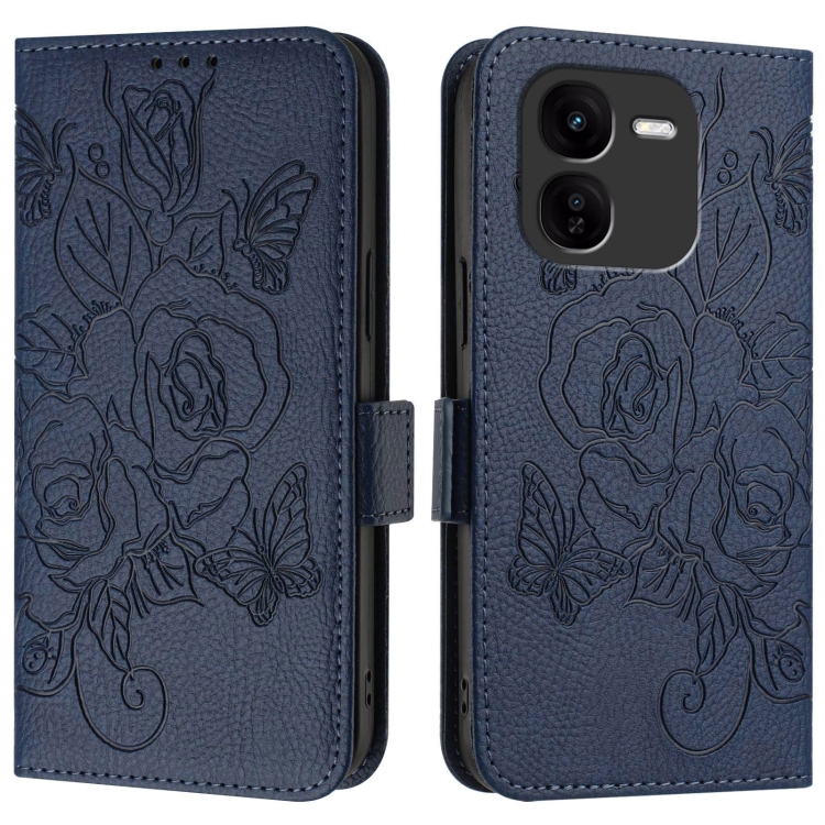 Para Vivo Iqoo Z9X Funda para Teléfono de Cuero Antirrobo Rfid con Rosa En Relieve (Azul Oscuro)