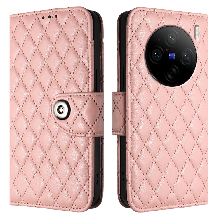Para Vivo X100S Funda para Teléfono de Cuero con Tapa con Textura Rómbica y Cordón (Rosa Coral)