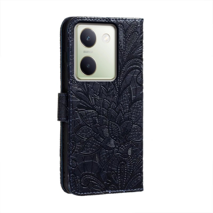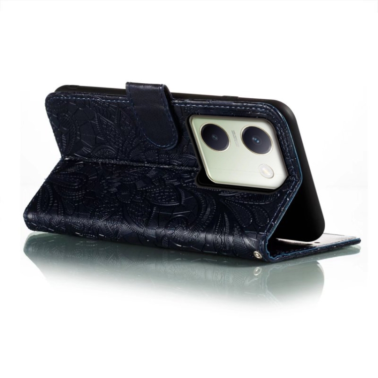 Para Vivo Y100 5G Funda para Teléfono de Cuero con Tapa y Estampado de Flores de Encaje (Azul Oscuro)