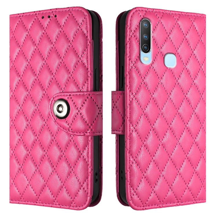 Para Vivo Y17 / Y15 / Y12 / Y11 2019 Funda para Teléfono de Cuero con Tapa con Textura Rómbica y Cordón (Rojo Rosa)