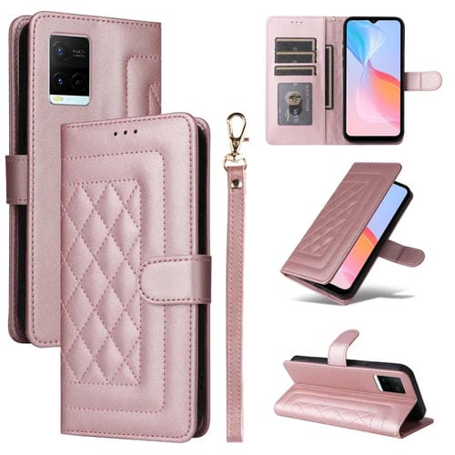 Para Vivo Y21 / Y33S Funda para Teléfono con Tapa de Cuero con Entramado de Diamantes (Oro Rosa)