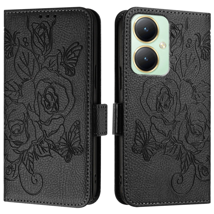 Para Vivo Y27 4G Global Embossed Rose Rfid Funda de Cuero Antirrobo para Teléfono (Negro)