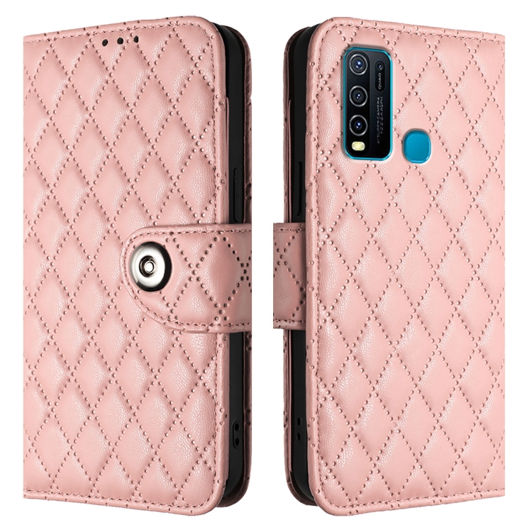 Para Vivo Y30 4G Funda para Teléfono con Tapa de Cuero con Textura Rómbica Global y Cordón (Rosa Coral)
