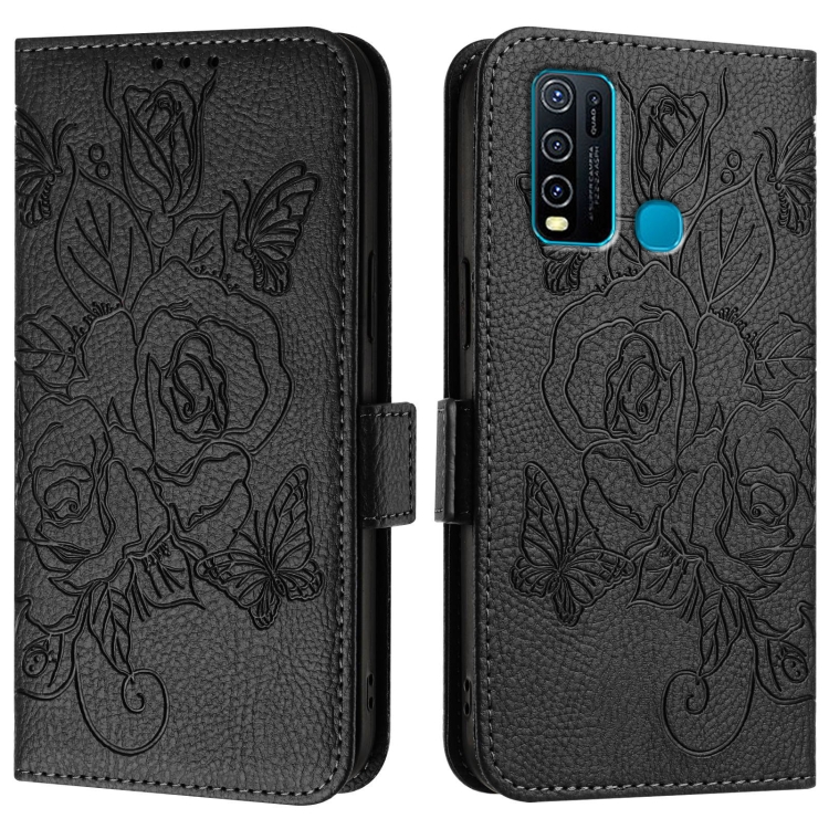 Para Vivo Y30 4G Global Embossed Rose Rfid Funda de Cuero Antirrobo para Teléfono (Negro)