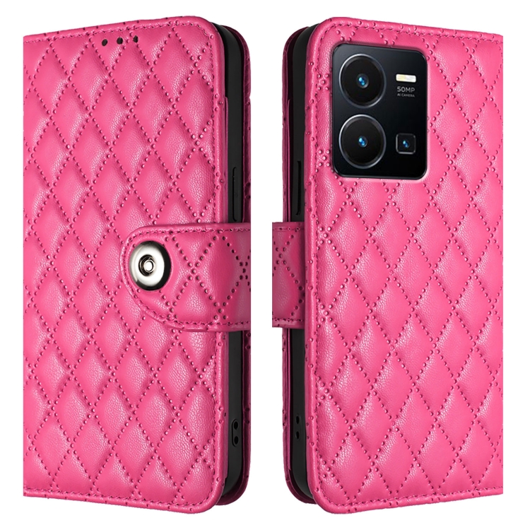 Para Vivo Y35 4G / Y22S / Y22 Funda para Teléfono con Tapa de Cuero con Textura Rómbica y Cordón (Rojo Rosa)