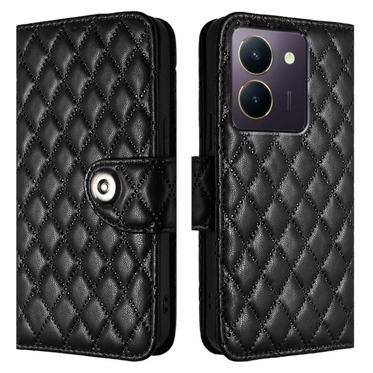 Para Vivo Y36 5G / Y36 4G / Y36 India Funda de Cuero con Tapa con Textura Rómbica y Cordón (Negro)