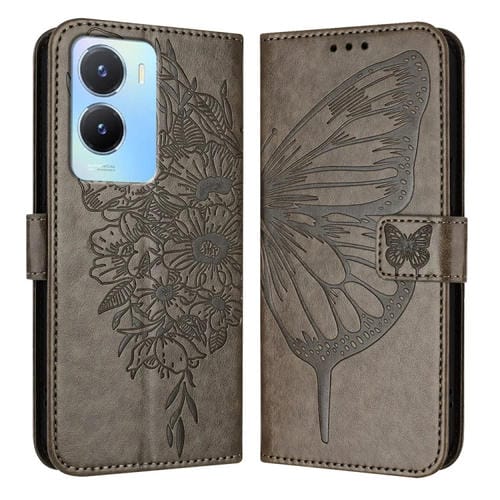 Para Vivo Y56 5G / Y16 4G / Y02S 4G Funda para Teléfono de Cuero con Mariposa En Relieve Global (Gris)