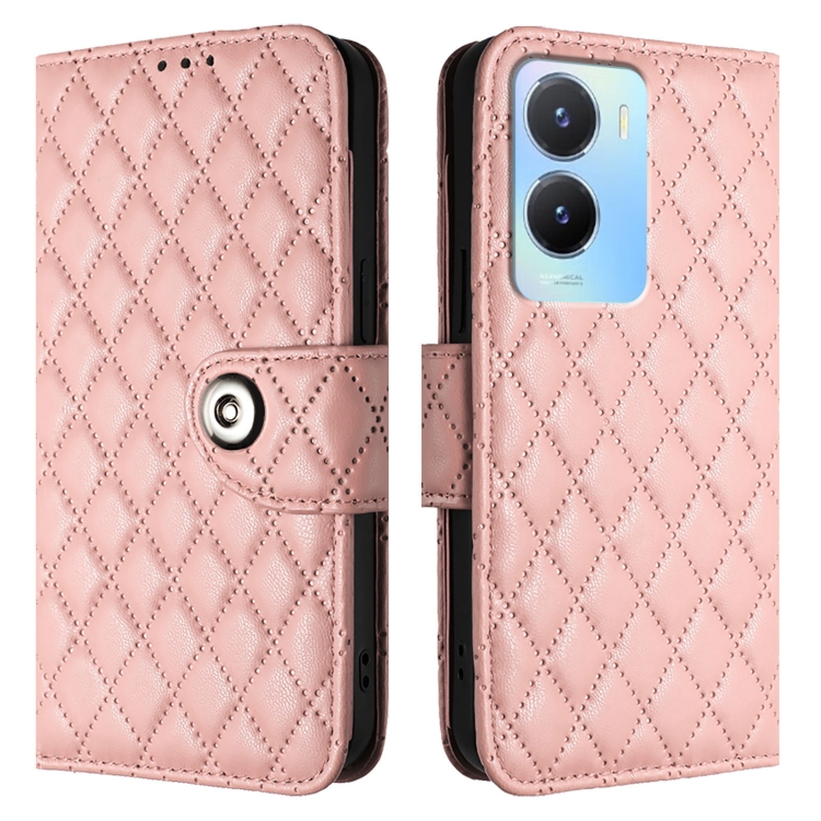 Para Vivo Y56 / Y16 / Y02S Funda para Teléfono con Tapa de Cuero con Textura Rómbica y Cordón (Rosa Coral)