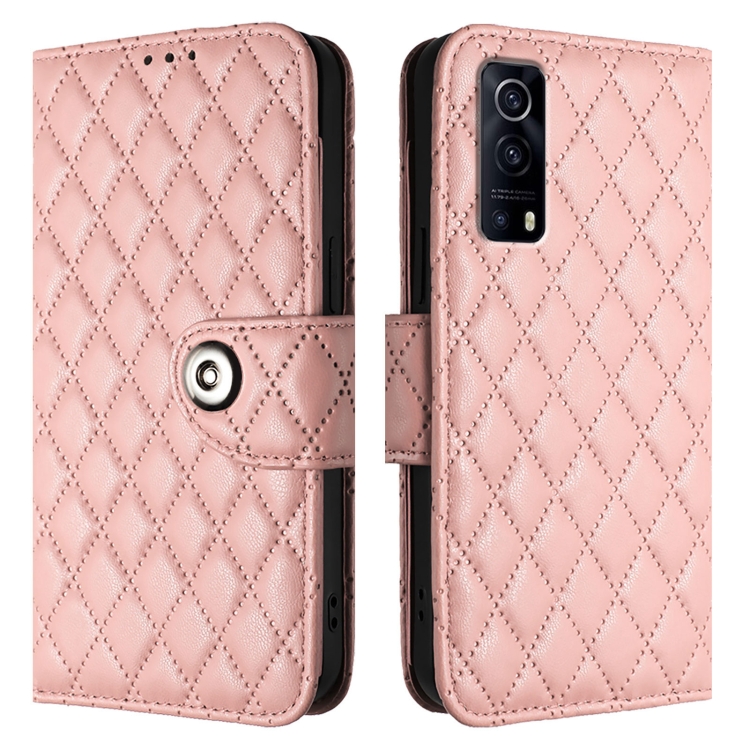 Para Vivo Y72 5G / Iqoo Z3 / Y52 5G Funda para Teléfono con Tapa de Cuero con Textura Rómbica y Cordón (Rosa Coral)