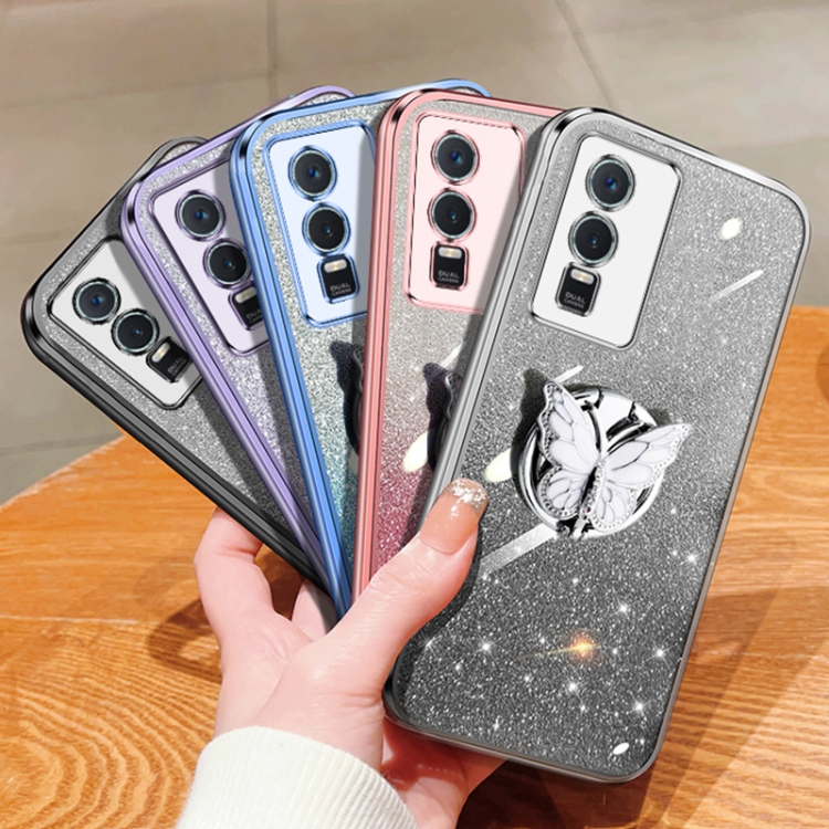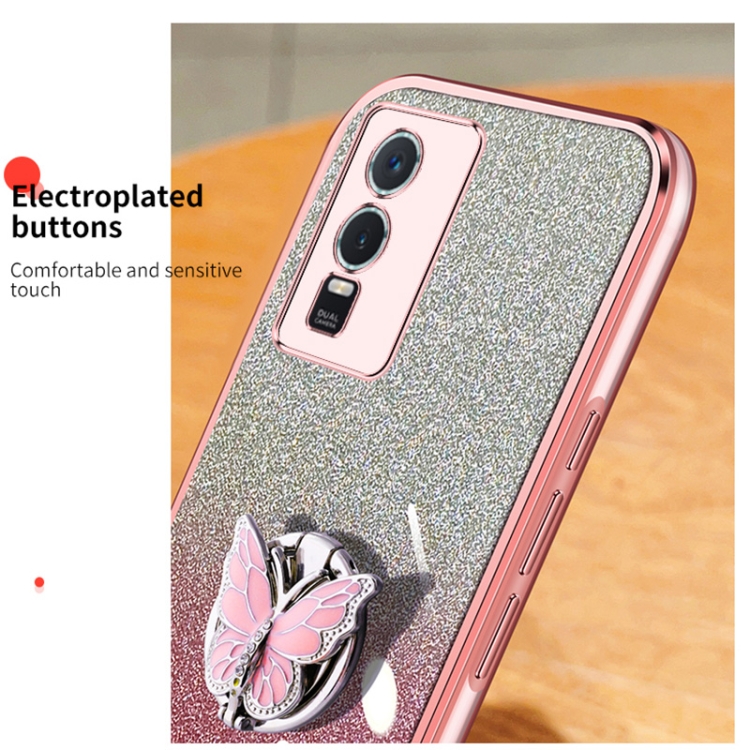 Para Vivo Y76S Estuche para Teléfono de TPU con Soporte de Mariposa con Brillo Degradado Plateado (Negro)