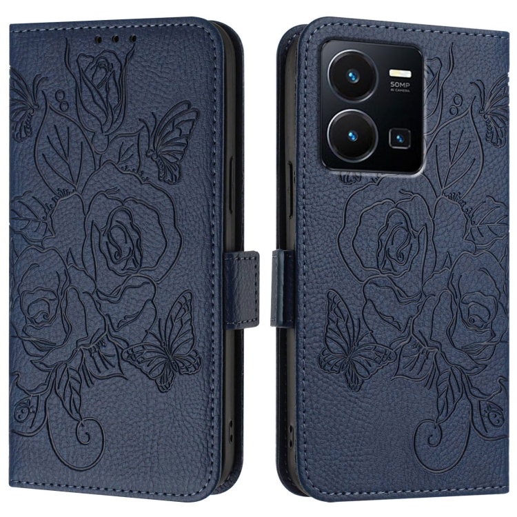 Para Vivo Y77 5G Global / Y77E 5G Funda para Teléfono de Cuero Antirrobo Rfid con Rosa En Relieve (Azul Oscuro)