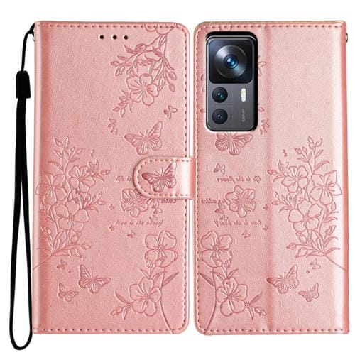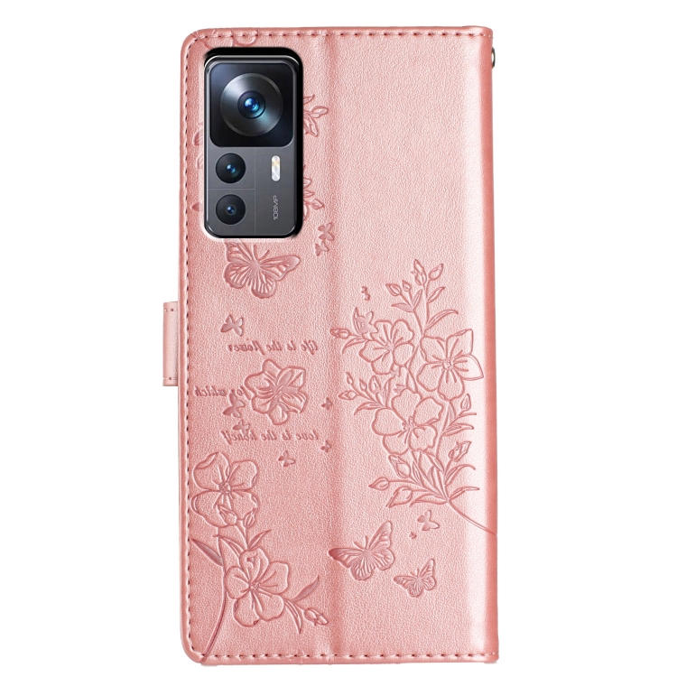 Para Xiaomi 12T / 12T Pro Funda de Cuero para Teléfono con Mariposas y Flores (Oro Rosa)