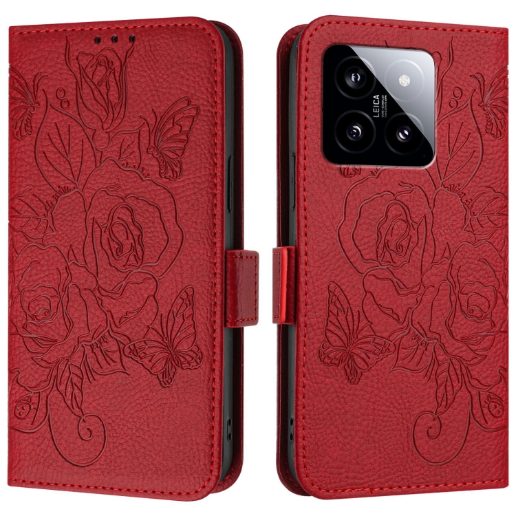 Para Xiaomi 14 5G Funda De Teléfono De Cuero Antirrobo Rfid Con Relieve Rosa (Rojo)