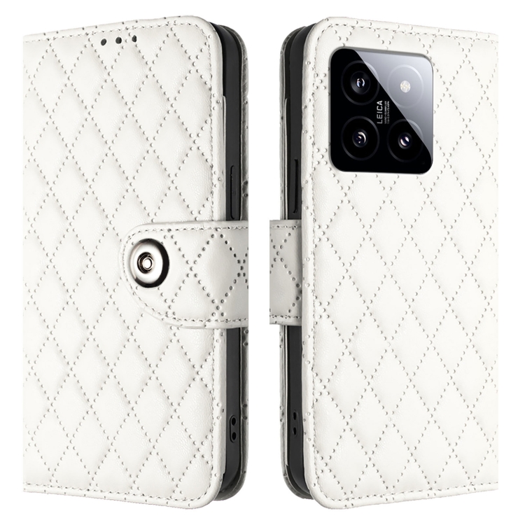 Para Xiaomi 14 Funda De Teléfono De Cuero Con Tapa Con Textura Rómbica Y Cordón (Blanco)
