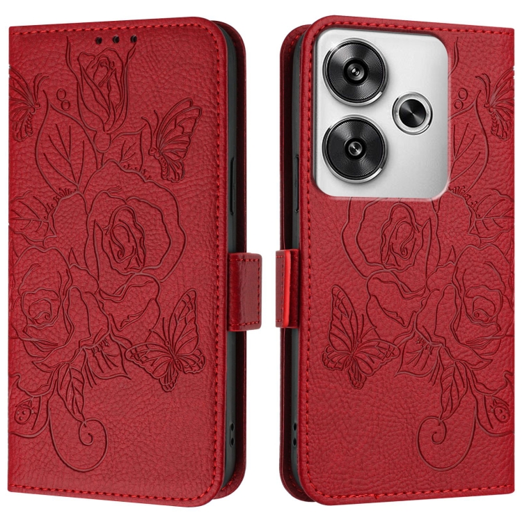 Para Xiaomi Poco F6 5G Funda de Teléfono de Cuero Antirrobo Rfid con Relieve Rosa (Rojo)