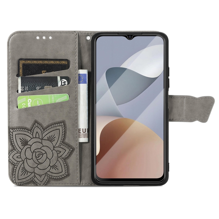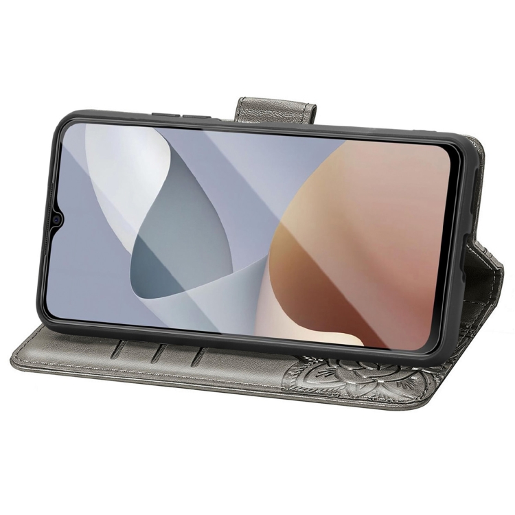 Funda para ZTE Blade A54 de Cuero con Relieve de Flor y Mariposa (Gris)
