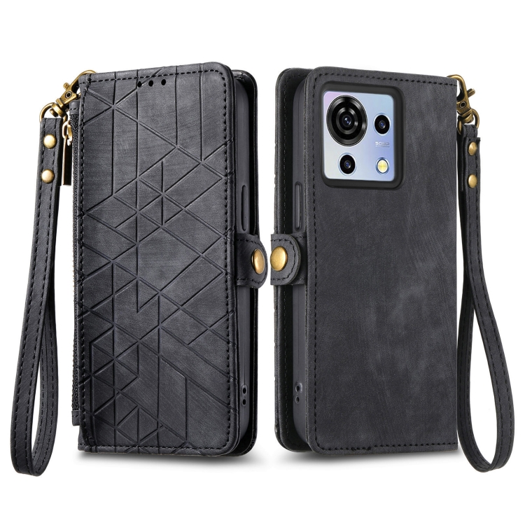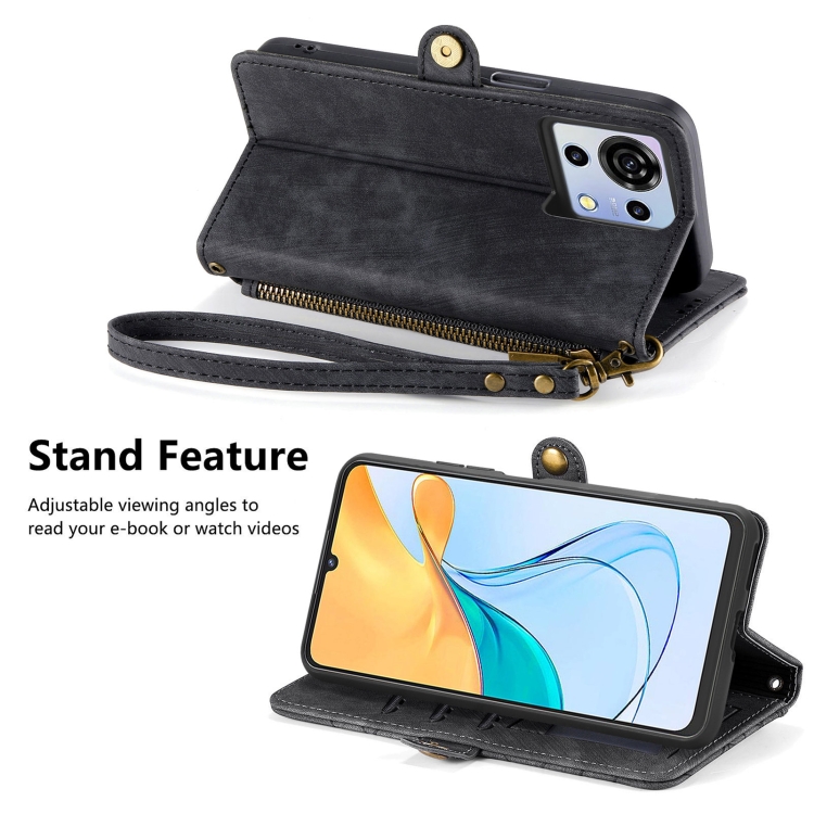 Funda de Cuero para ZTE Blade V50 Vita con Hebilla Lateral y Billetera con Cremallera (Negro)