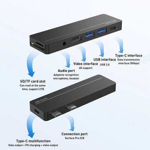 - Interfaz de salida: HDMI 4K (3840x2160) a 30Hz, LAN, ranura para Tarjeta SD/TF (lectura simultánea hasta 2TB), USB 3.0 con tasa de transferencia de 5 Gbps, Puerto Type-C para Carga PD60W/100W y transmisión de datos a 10 Gbps, Puerto de audio de 3,5 mm