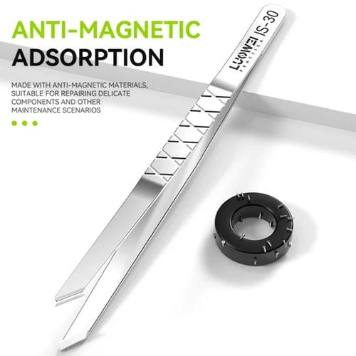 Las pinzas para Placa Base antideslizantes Luowei IS-30 están diseñadas para ofrecer un manejo preciso y seguro de capas de Placas Base durante procesos de Reparación y mantenimiento electrónico. Este modelo incorpora un diseño innovador con un ángulo de 35 grados, optimizado para evitar daños en Componentes delicados y facilitar el agarre en espacios reducidos. Fabricadas en acero inoxidable de grado aeroespacial con propiedades antimagnéticas, estas pinzas garantizan alta tenacidad, elasticidad y resistencia a la corrosión, lo que las hace adecuadas para trabajos Técnicos que requieren precisión y estabilidad. La textura antideslizante en forma de X proporciona un agarre firme y cómodo, mientras que su ancho ajustable permite adaptarse a diferentes tamaños de Componentes electrónicos, especialmente en Placas Base. Son compatibles con una amplia variedad de dispositivos y recomendadas para usuarios que reparan por cuenta propia o Técnicos especializados en electrónica.