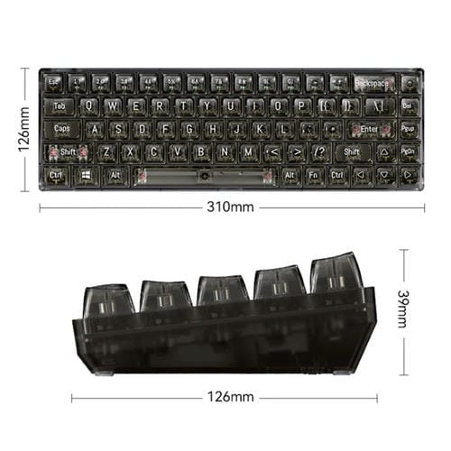 • Formato compacto de 68 teclas; tecnología de Botón: eje mecánico (amarillo, rojo, azul); interfaz USB-C desmontable; voltaje 3,3 V-5,5 V; Corriente 150 mA; dimensiones 310x126x39 mm; peso 427 gramos