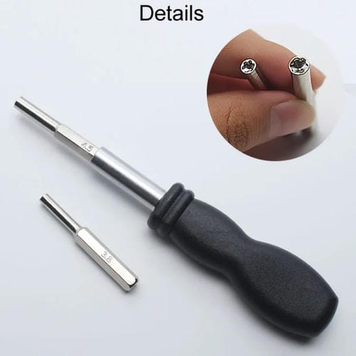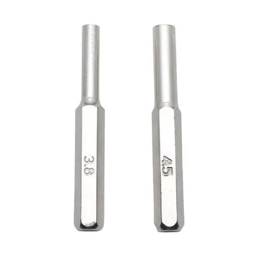 - Destornillador de 3,8 mm (50 mm de longitud), destornillador de 4,5 mm (50 mm de longitud), mango ergonómico de 28 x 114 mm; peso aproximado: 10,2 g (3,8 mm), 12,4 g (4,5 mm), 40 g (mango)