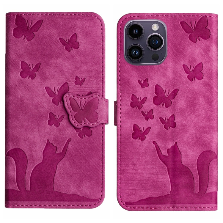 Funda de Cuero para iPhone 14 Pro Max Butterfly Cat con Tapa en Relieve (Rosa)