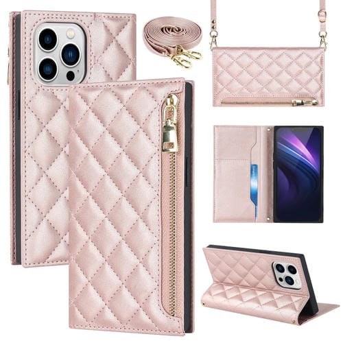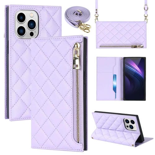 Funda de Cuero con Cremallera para iPhone 13 Pro Max Grid Texture Lanyard (Púrpura)