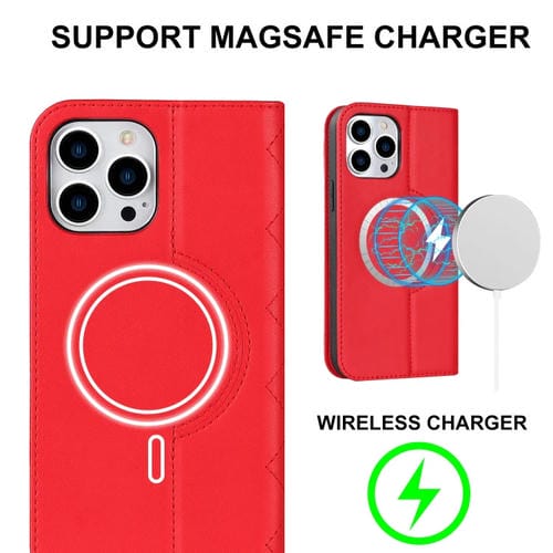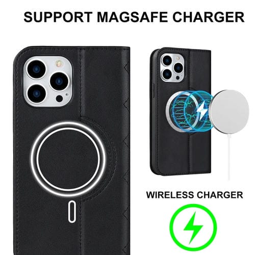 Funda para iPhone 13 Pro Max Rhombic Magsafe Rfid Antirrobo de Cuero (Negro)