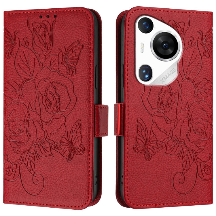 Funda de Cuero Antirrobo RFID para Huawei Pura 70 Pro con Relieve Rosa (Rojo)