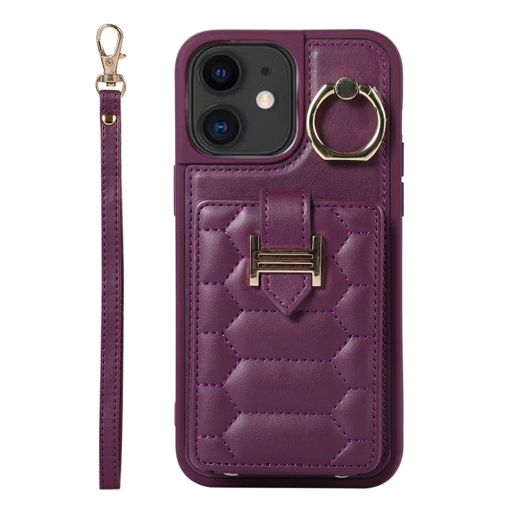 Funda para iPhone 11 Vertical Card Bag Ring Holder con Doble Cordón (Morado Oscuro)