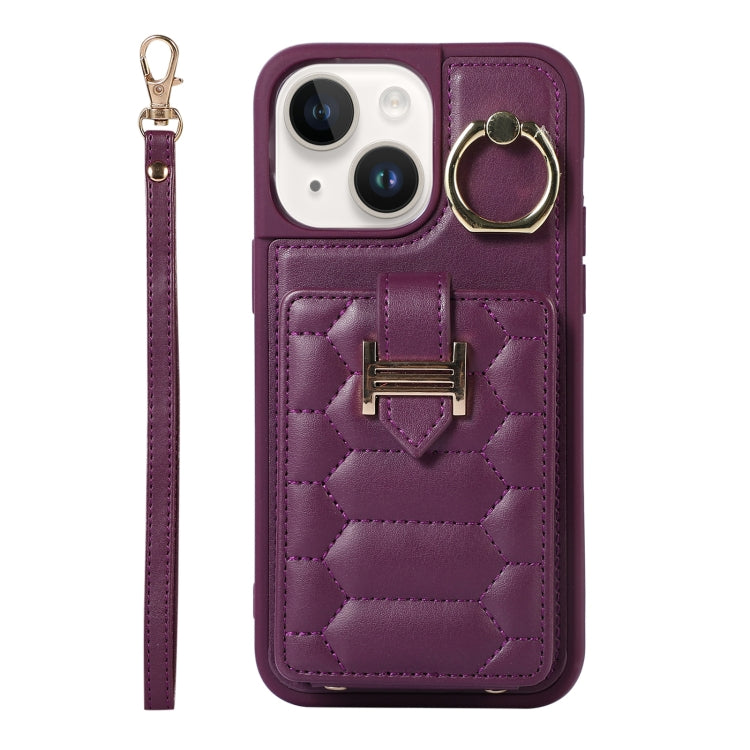 Funda para iPhone 14 Vertical Card Bag Ring Holder con Doble Cordón (Púrpura)