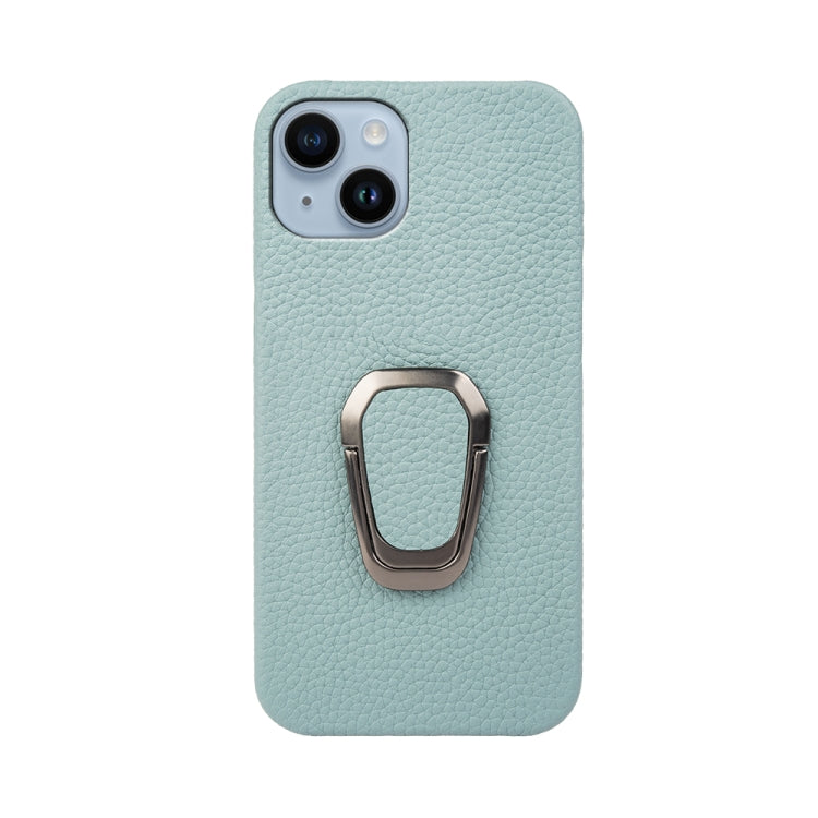 For iPhone 14 Ring Holder Litchi Texture Genuine Leather Phone Case(Cyan)
