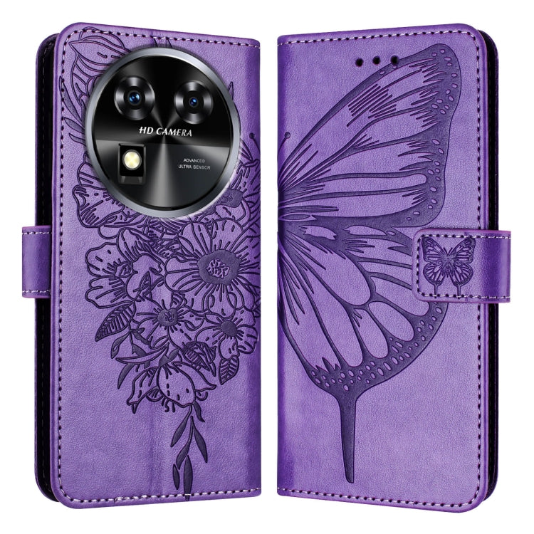 Funda de Cuero para Oukitel C37 con Diseño de Mariposa en Relieve (Morado)