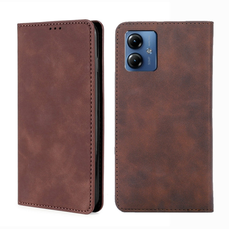 Funda de Cuero Magnética Skin Feel para Motorola Moto G14 4G (Marrón Oscuro)