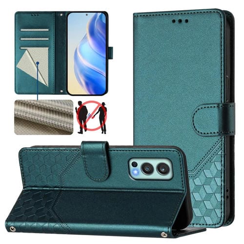 Funda de Cuero Rfid con Relieve en Panal para OnePlus Nord 2 (Verde Pavo Real)