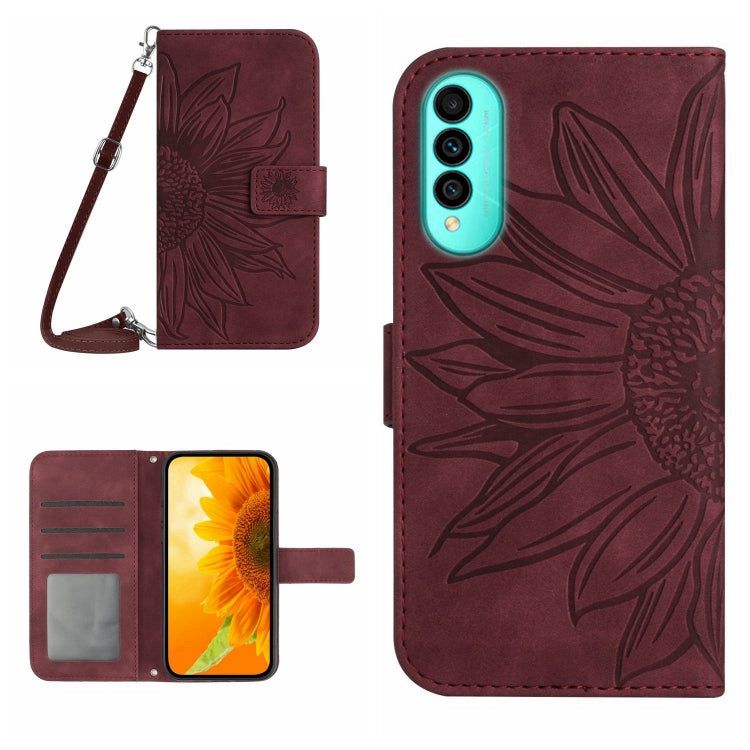 Funda Flip de Cuero Wiko T50 Skin Feel con Cordón y Patrón Sun Flower (Rojo Vino)