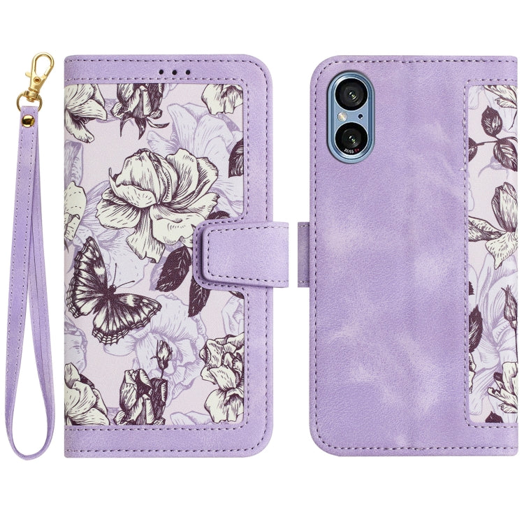 Funda de Cuero para Sony Xperia 5 V con Estampado Floral y Cordón (Morado Claro)