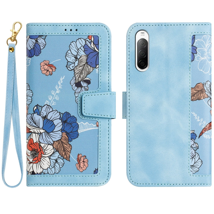 Funda de Cuero para Sony Xperia 10 V con Estampado Floral y Cordón (Azul Claro)