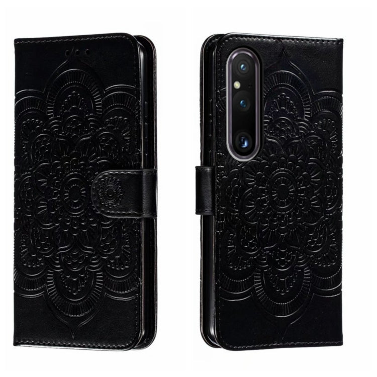Funda de Cuero para Sony Xperia 1 V con Patrón Sun Mandala en Relieve (Negro)