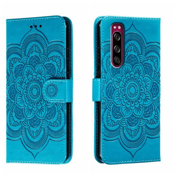 Funda de Cuero para Sony Xperia 5 con Patrón en Relieve Sun Mandala (Azul)