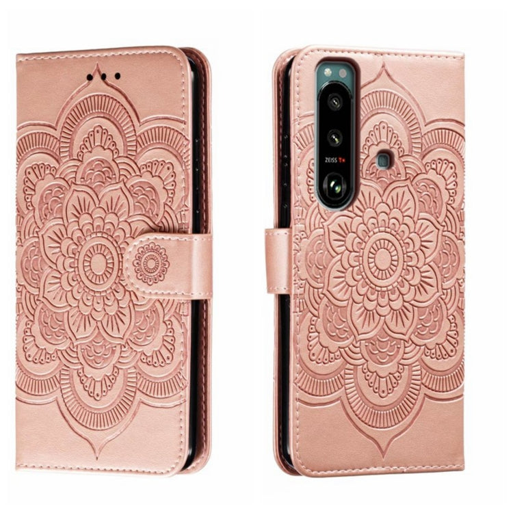 Funda de Cuero para Sony Xperia 5 III con Patrón Sun Mandala en Relieve (Oro Rosa)