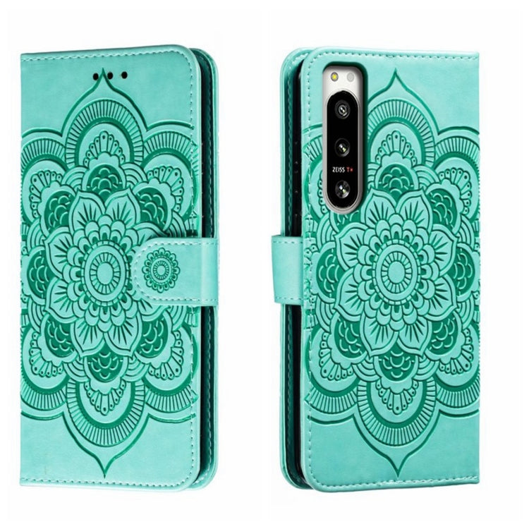 Funda de Cuero para Sony Xperia 5 IV con Patrón Sun Mandala en Relieve (Verde)