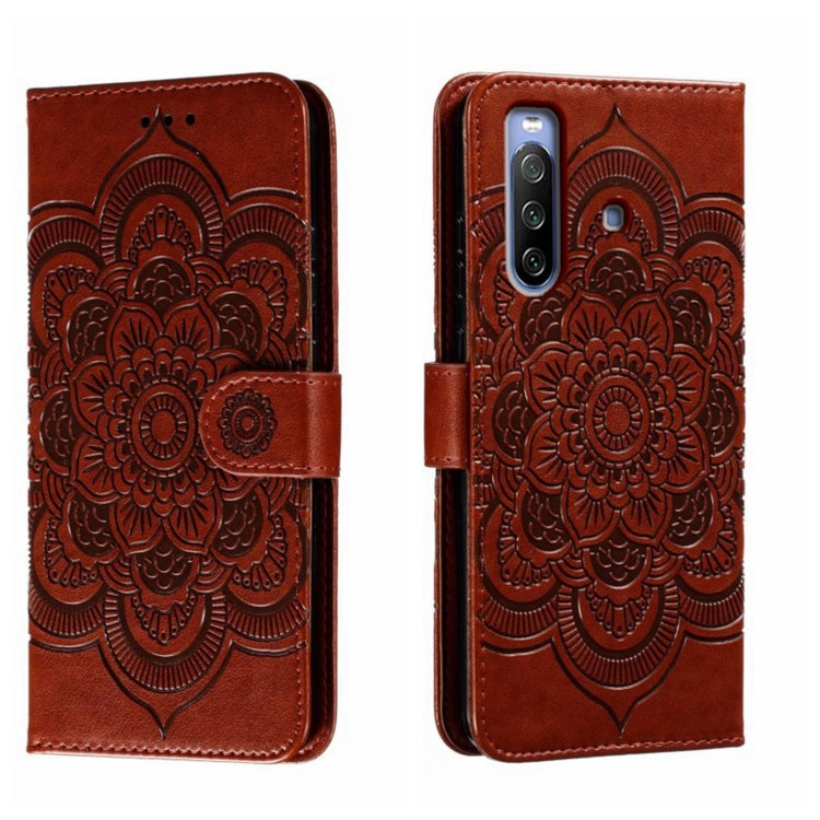 Funda de Cuero para Sony Xperia 10 III con Patrón en Relieve Sun Mandala (Marrón)