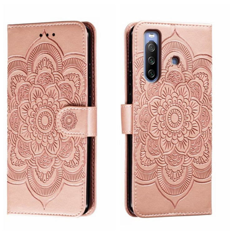 Funda de Cuero para Sony Xperia 10 III con Patrón En Relieve Sun Mandala (Oro Rosa)