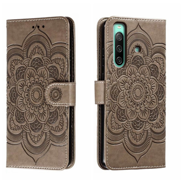 Funda de Cuero para Sony Xperia 10 IV con Patrón Sun Mandala en Relieve (Gris)