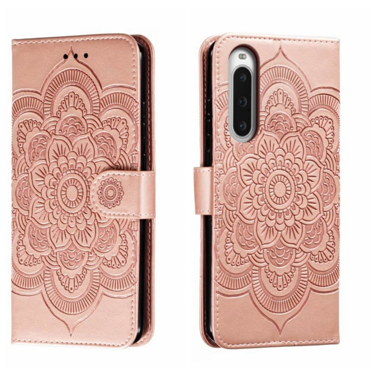 Funda de Cuero para Sony Xperia 10 IV con Patrón Sun Mandala en Relieve (Oro Rosa)