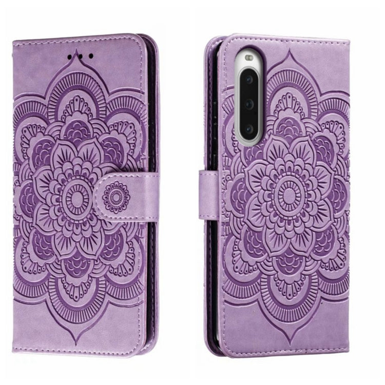 Funda de Cuero para Sony Xperia 10 V con Patrón Sun Mandala en Relieve (Púrpura)