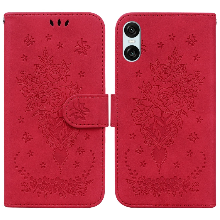Funda para Sony Xperia 5 Vi de Cuero con Relieve de Mariposa y Rosa (Rojo)