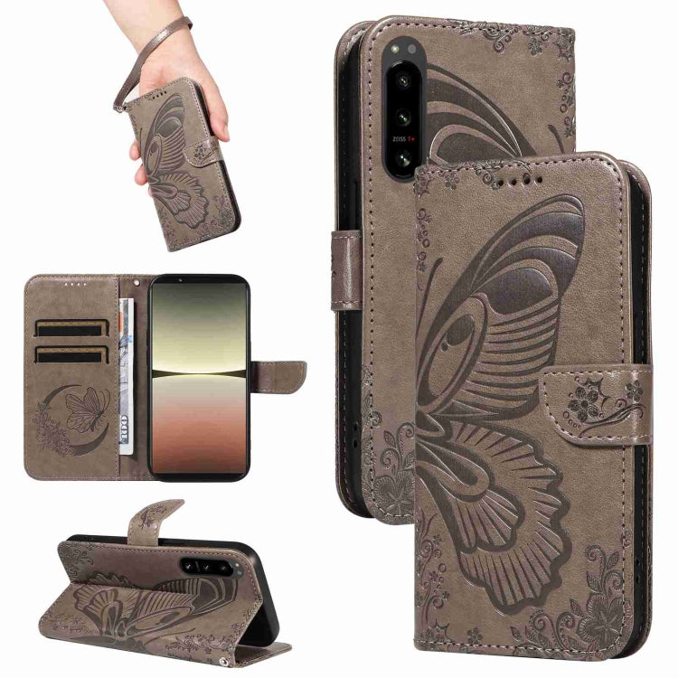 Funda de Cuero para Sony Xperia 5 V Swallowtail Butterfly en Relieve (Gris)