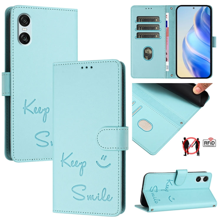 Funda de Cuero Rfid para Sony Xperia 10 V 4G con Relieve Sonriente (Verde Menta)